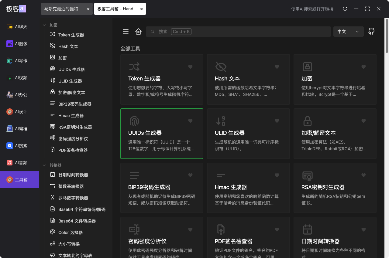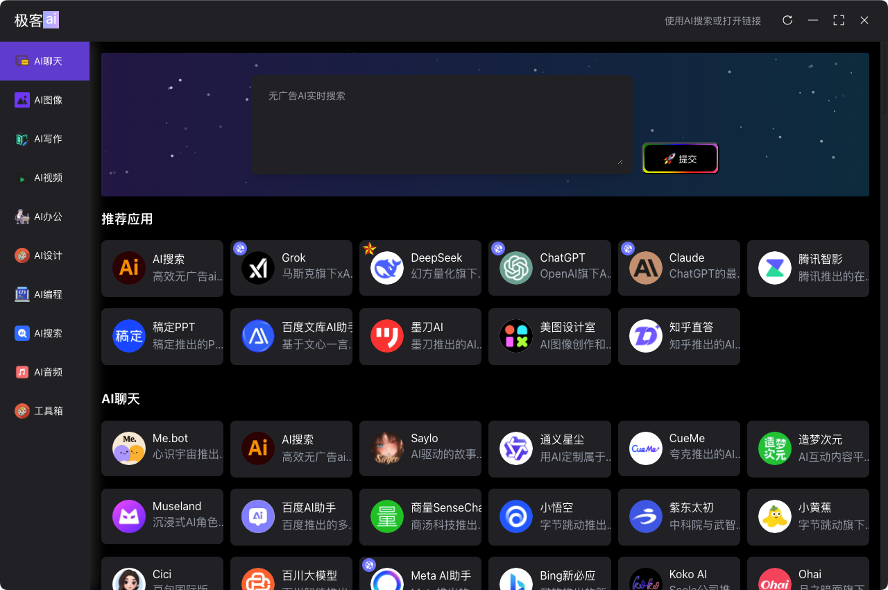 一款支持多种大模型(LLM)提供商的跨平台桌面客户端。同时集成AI 搜索、开发者工具集与第三方 AI 工具入口。